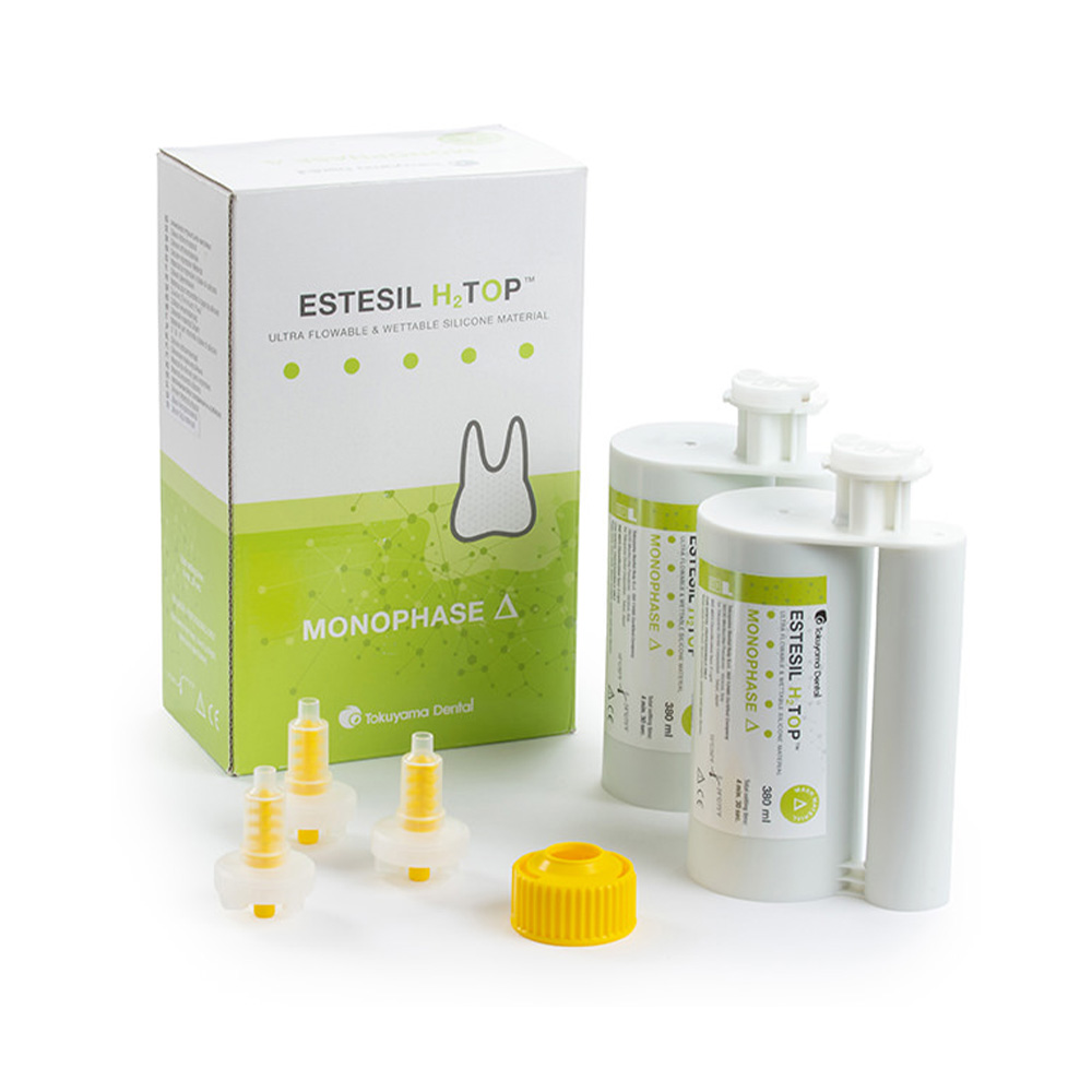ESTESIL H2TOP Monophase 5:1 je addiční (A-silikonový) otiskovací materiál na bázi polyvinylsiloxanu s hydrofilními plnivy a surfaktanty, které zajišťují výbornou smáčivost i za přítomnosti vlhkosti. Dodává se v 5:1 kartuši pro mechanické míchání, kompatibilní s většinou běžných automatických míchacích zařízení. Je ideální jako základní hmota pro monofázovou dvouviskozitní techniku a techniku duálního oblouku, především při zhotovování korunek, můstků, inlayí, onlayí a faset.