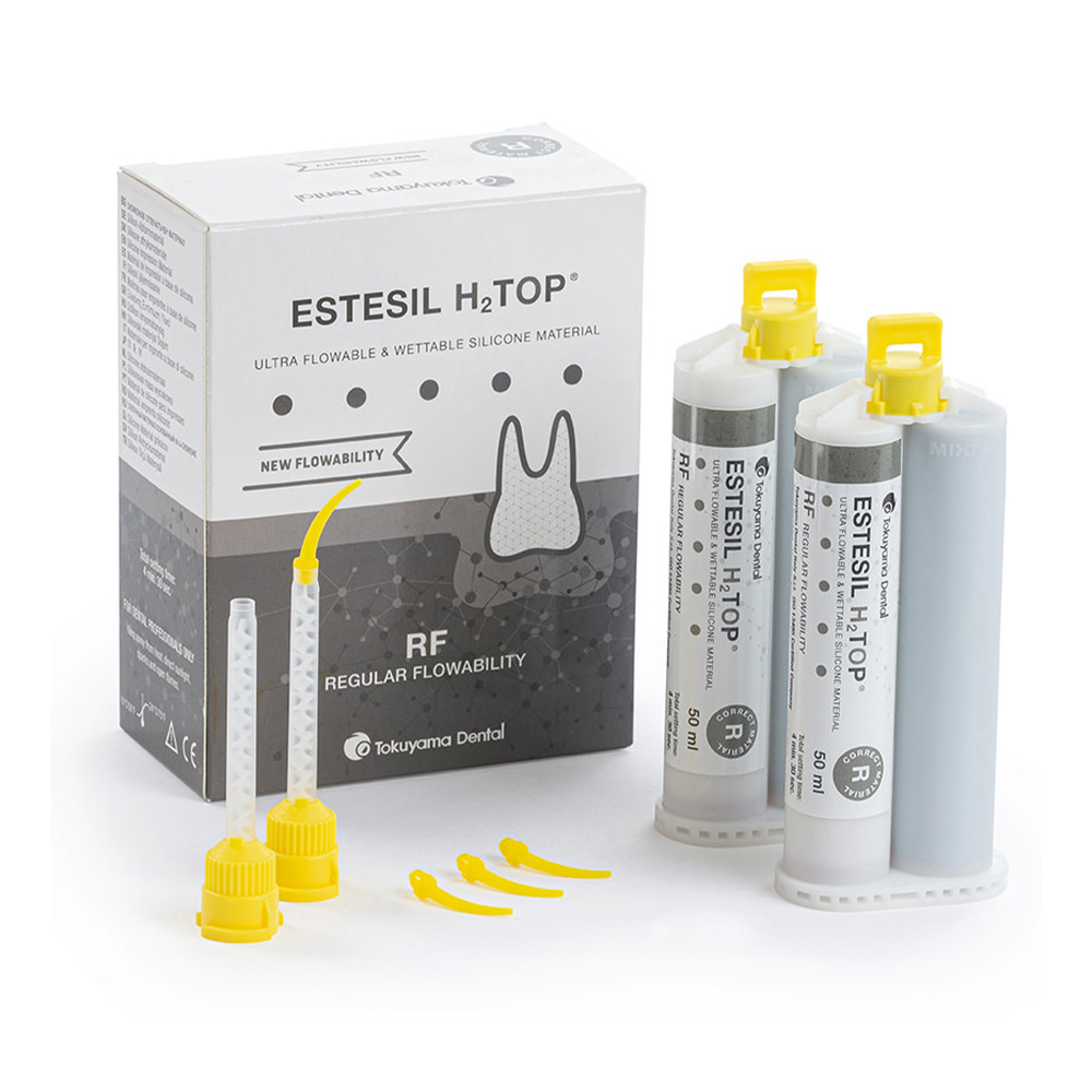 ESTESIL H2TOP Regular Flow je addiční (A-silikonový) otiskovací materiál na bázi polyvinylsiloxanu s hydrofilními plnivy a surfaktanty, které zajišťují vynikající smáčivost a přesnost detailů, i ve vlhkém prostředí. Dodává se ve verzi s kartuší 1:1 pro použití v běžných míchacích pistolích. Ideální pro precizní otisky při supragingiválních preparacích, zejména u korunek, můstků a dalších protetických prací.