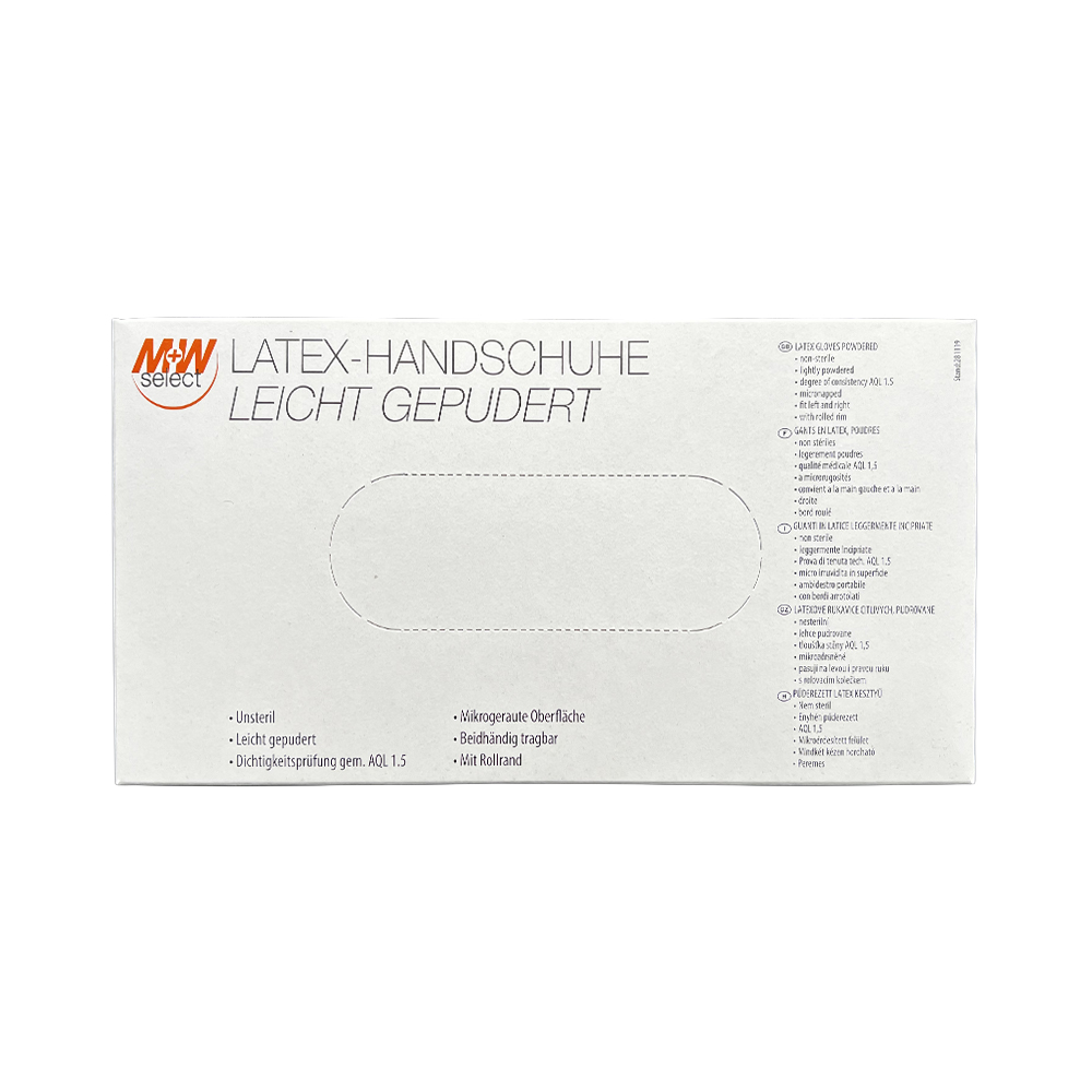 Nesterilní, lehce pudrované latexové rukavice, AQL 1,5. Vysoký komfort při nošení, obzvlášť tenké, ale zároveň odolné proti roztržení. Balení obsahuje 100 kusů.
