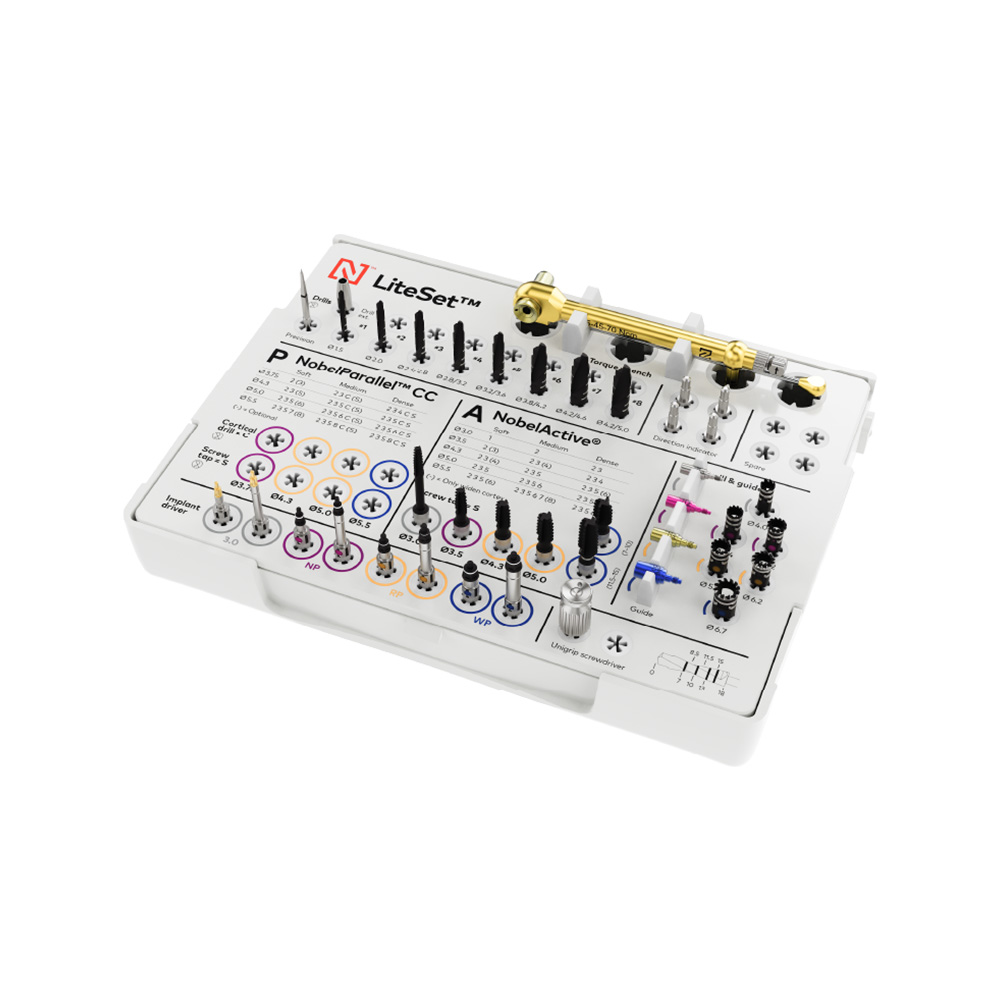 NobelActive LiteSet – instrumentárium pro zavádění jak NobelActive, tak Nobel Parallel. Vše v jedné kazetě. Pro Parallel set obsahuje pilotní vrták, kostní vrtáky , vrtáky do tvrdé kosti. Ostatní kmponenty do setu lze dokoupit.