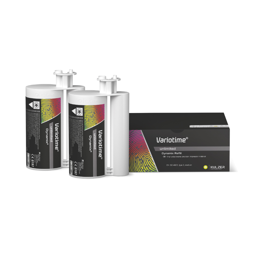 Variotime Unlimited od společnosti Kulzer je vysoce přesný A-silikonový (VPS) otiskovací materiál navržený pro moderní stomatologii. Kombinuje špičkovou přesnost, flexibilitu použití a inovativní časový koncept, který usnadňuje práci a zvyšuje spolehlivost výsledků. Díky své univerzálnosti je vhodný pro široké spektrum indikací – od jednotlivých korunek až po rozsáhlé protetické a implantologické práce.